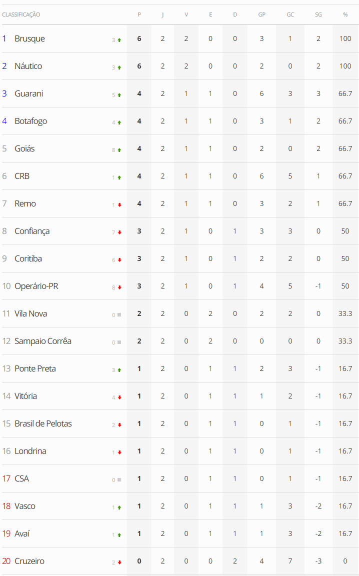Terminada a 2ª rodada do Brasileiro da Série B, o Vasco, que empatou com a Ponte Preta por 1 a 1, subiu da 19ª e penúltima para a 18ª e antepenúltima colocação na classificação.