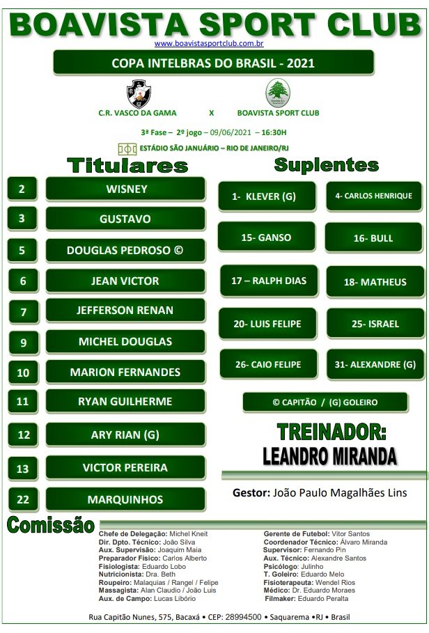 Escalação do Boavista. Ary; Wisney, Gustavo Geladeira, Victor Pereira e Jean Victor; Douglas Pedroso, Marion e Ryan Guilherme; Jefferson Renan, Marquinhos e Michael Douglas. Técnico é Leandrão, ex-atacante do Vasco. #ColinaENM