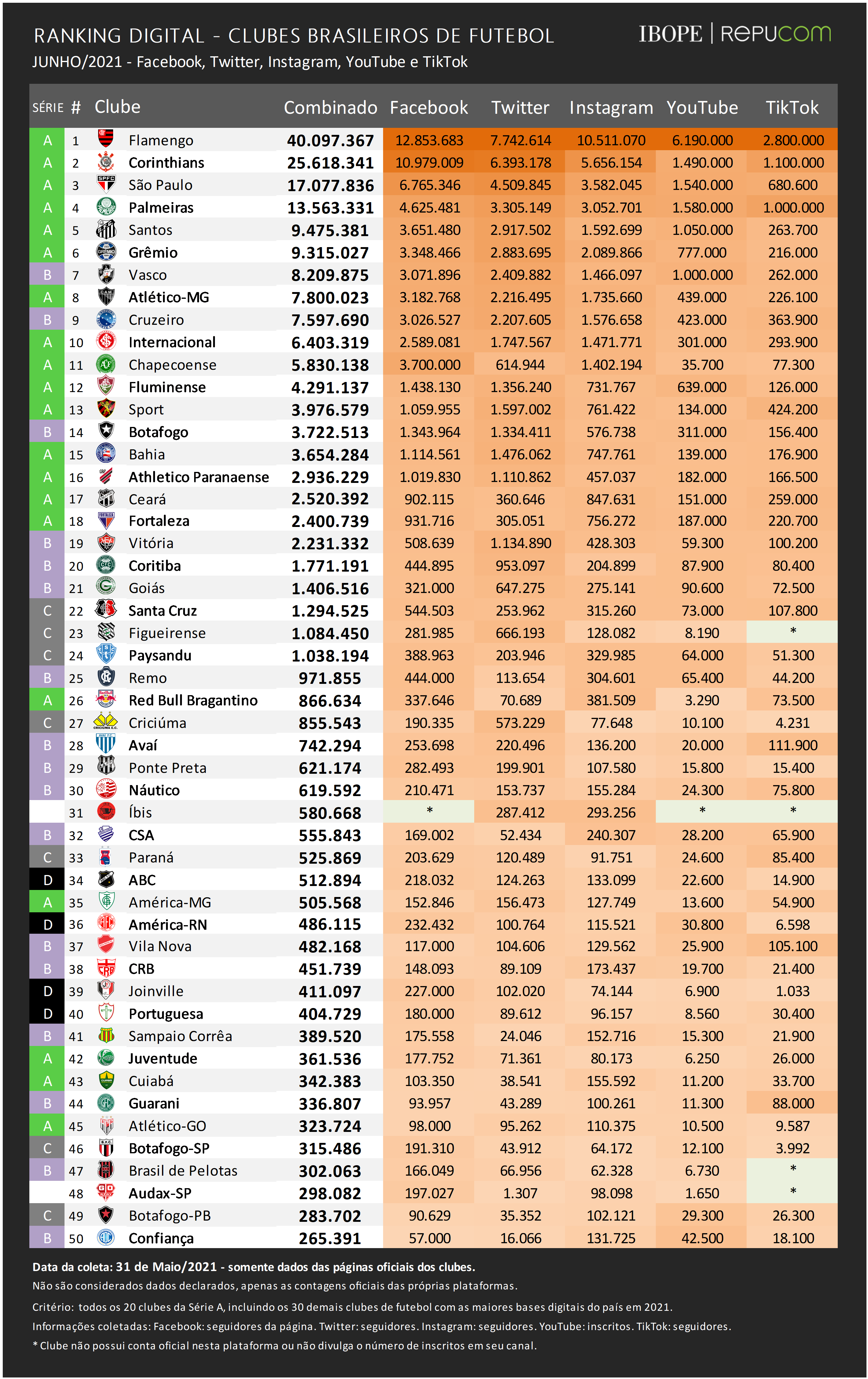 O levantamento é divulgado mensalmente pelo IBOPE Repucom e tem o objetivo de acompanhar o desenvolvimento das bases digitais dos 50 clubes com o maior número de seguidores do país.