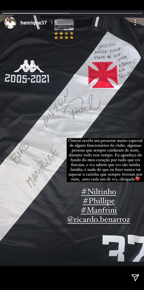 O lateral Henrique recebeu uma homenagem de alguns dos funcionários que acompanharam sua trajetória no Vasco da Gama. A camisa autografada pelos funcionários faz menção ao tempo de casa do ex-vascaíno.
