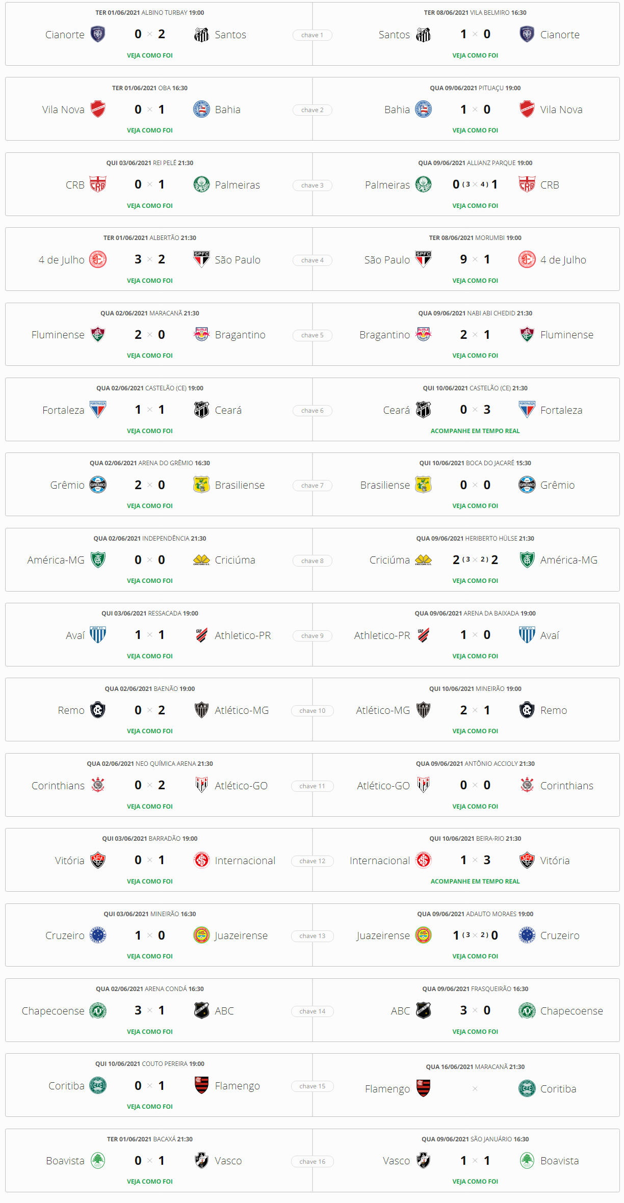 Após os jogos desta 5ª-feira da Copa do Brasil, já são conhecidos 15 dos 16 clubes classificados às oitavas de final: ABC, Athletico-PR, Atlético-GO, Atlético-MG, Bahia, CRB, Criciúma, Fluminense, Fortaleza, Grêmio, Juazeirense-BA, Santos, São Paulo e VASCO. Flamengo e Coritiba lutam pela última vaga. O destaque desta 5ª-feira foi a eliminação do Internacional, em casa, pelo Vitória, que teve a estreia do ex-técnico vascaíno Ramon Menezes. Os confrontos e mandos das oitavas de final ainda serão sorteados pela CBF. Veja os resultados da 3ª fase: