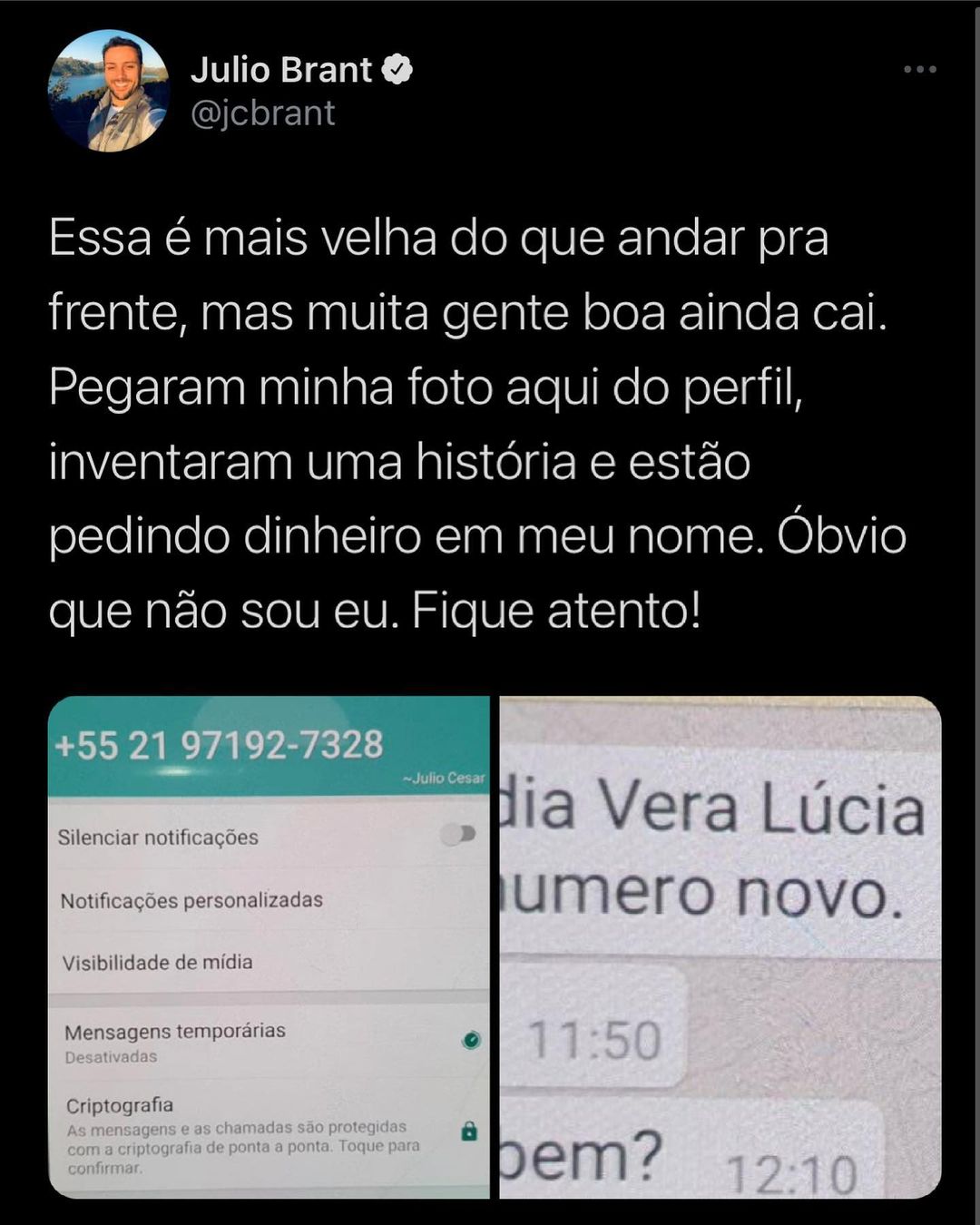 Julio Brant alerta para perfil fake no WhatsApp pedindo dinheiro em seu nome