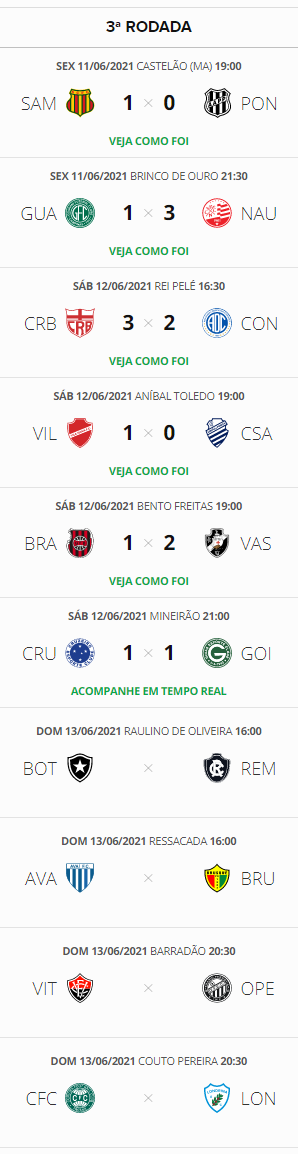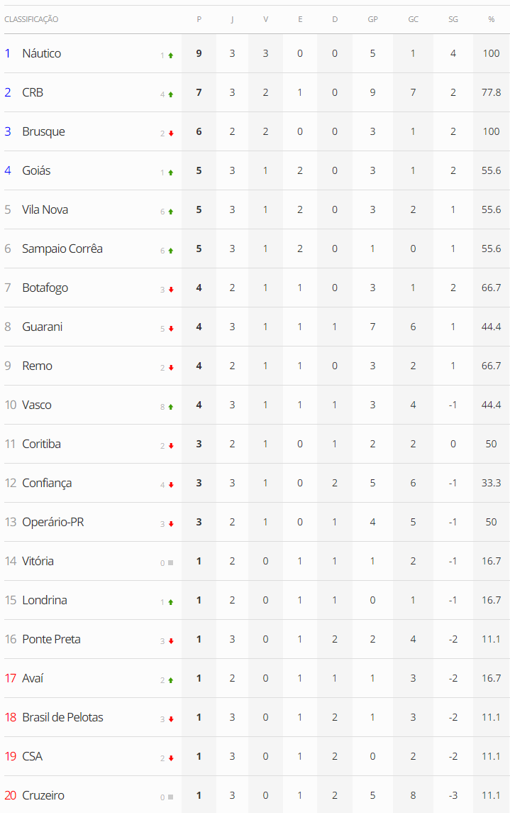 Terminados os jogos de sábado da 3ª rodada do Brasileiro da Série B, o Vasco, que derrotou o Brasil de Pelotas por 2 a 1, subiu para a 10ª colocação e deixou o Z4. Quatro partidas encerram a rodada neste domingo.