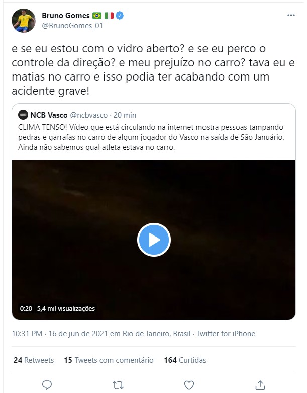 Torcedores do Vasco atiram pedras em carro de Bruno Gomes, que lamenta: "E se estou com vidro aberto?"