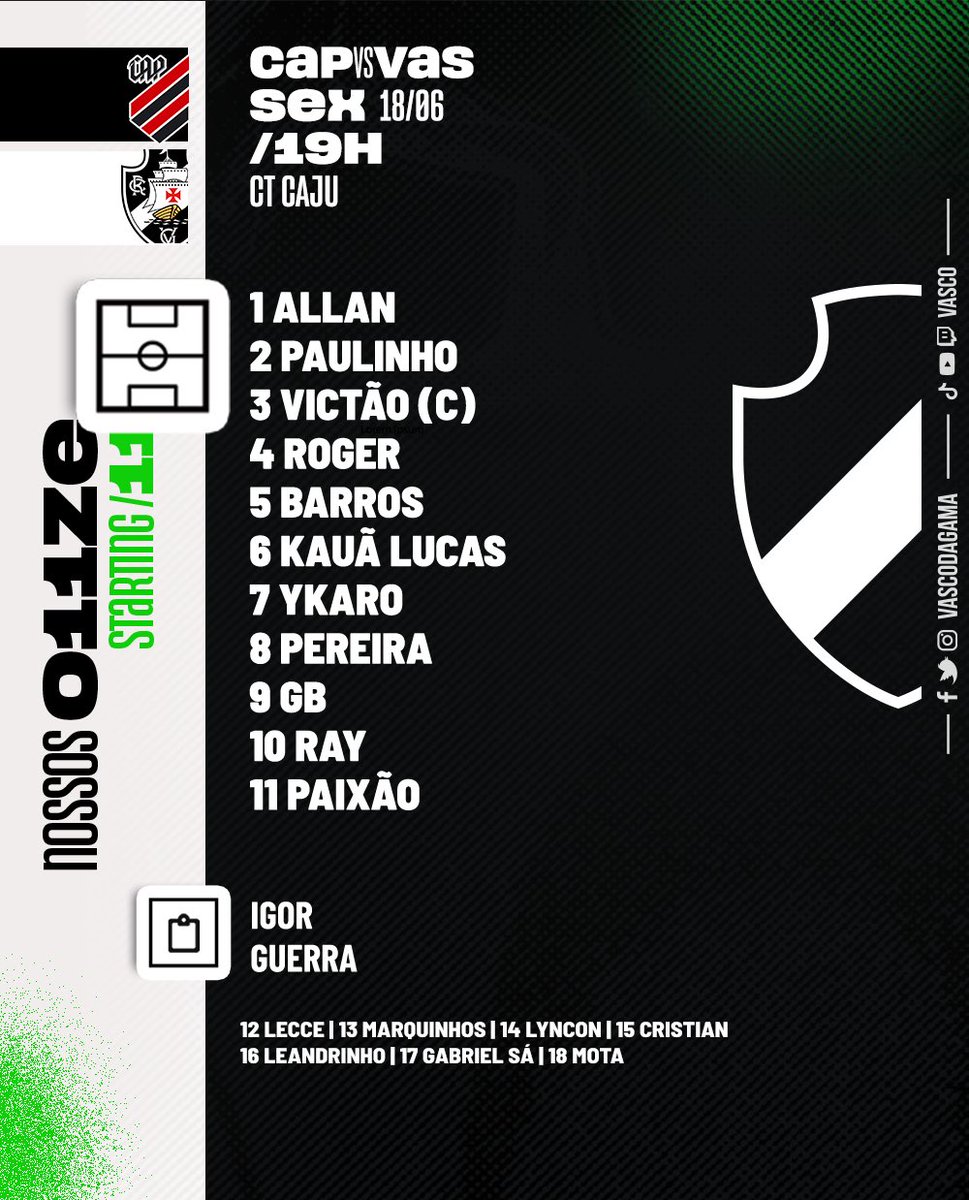 Juvenil: Confira a escalação do Vasco para o jogo contra o Athletico-PR