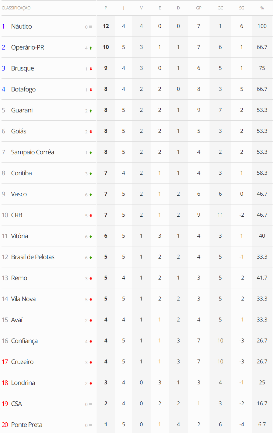 Terminados os jogos de sábado da 5ª rodada do Brasileiro da Série B, o Vasco, que derrotou o CRB por 3 a 0, subiu para a 9ª colocação.