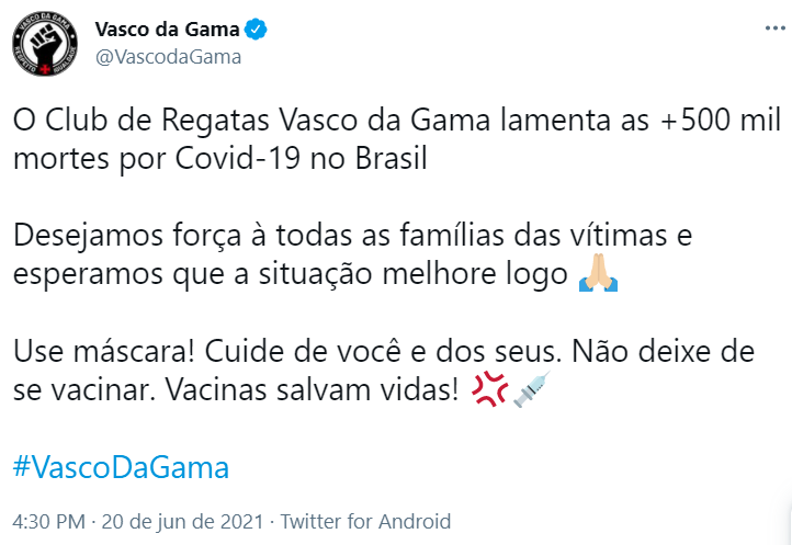 O Club de Regatas Vasco da Gama lamenta as 500 mil mortes por Covid-19 no Brasil