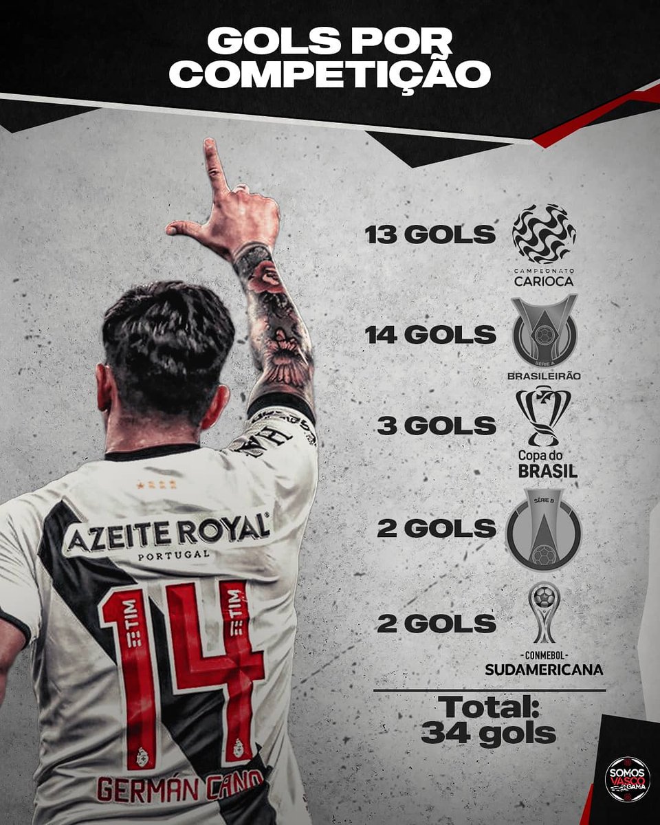 Germán Cano se tornou o 10° maior artilheiro do @VascodaGama no Século XXI.