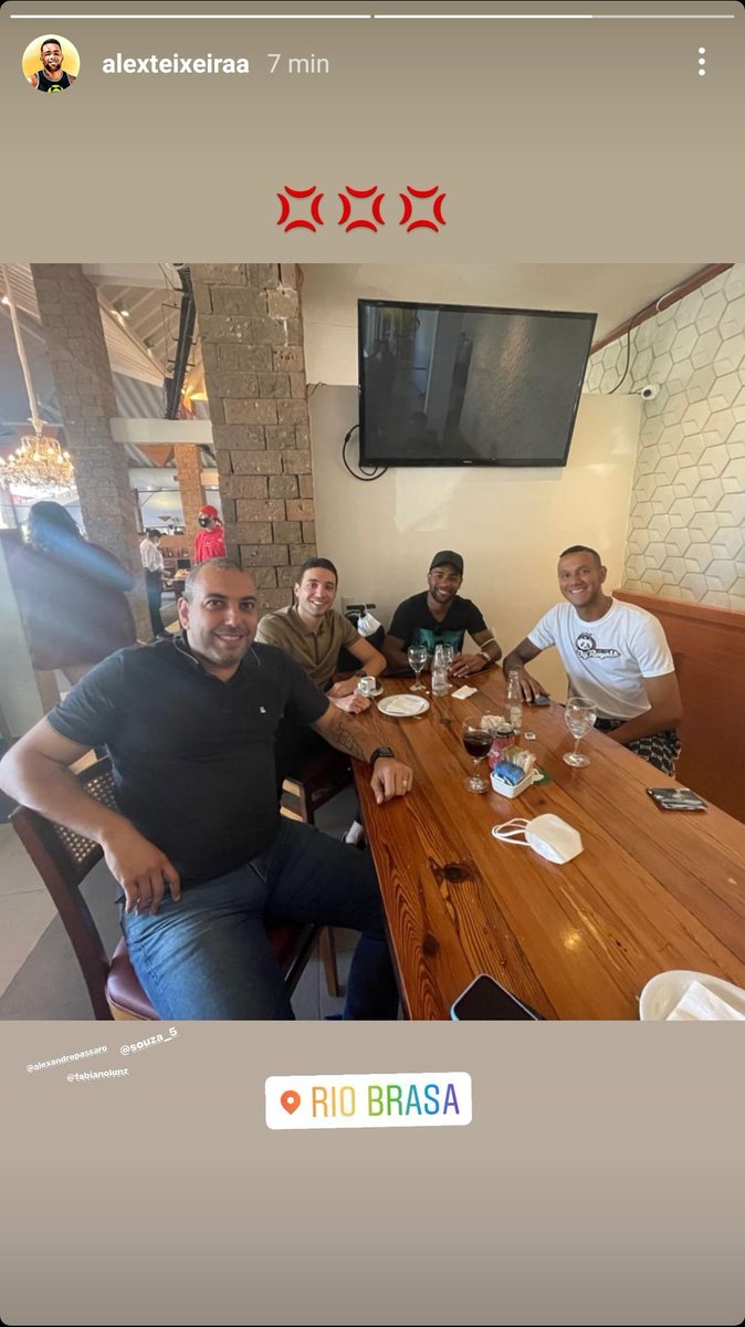 Em seu Instagram, Alex Teixeira publicou uma foto almoçando junto com o volante Souza e o diretor executivo do Vasco Alexandre Pássaro.