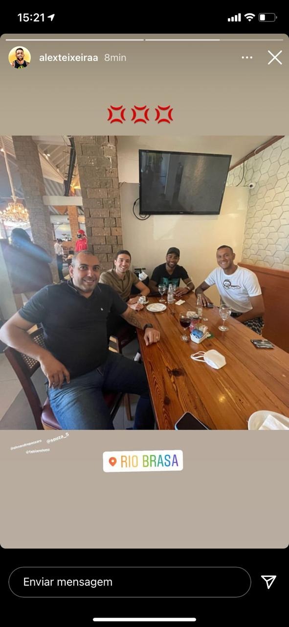 Uma publicação feita por Alex Teixeira em seu Instagram causou um grande alvoroço entre os vascaínos. O atacante postou uma foto em uma churrascaria na Barra da Tijuca, Zona Oeste do Rio, ao lado do diretor executivo de futebol, Alexandre Pássaro, do gerente Fabiano Lunz e do volante Souza, que também é cria de São Januário.