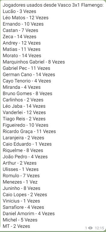 Veja quantas vezes cada jogador foi utilizado pelo Vasco após a vitória sobre o Urubu