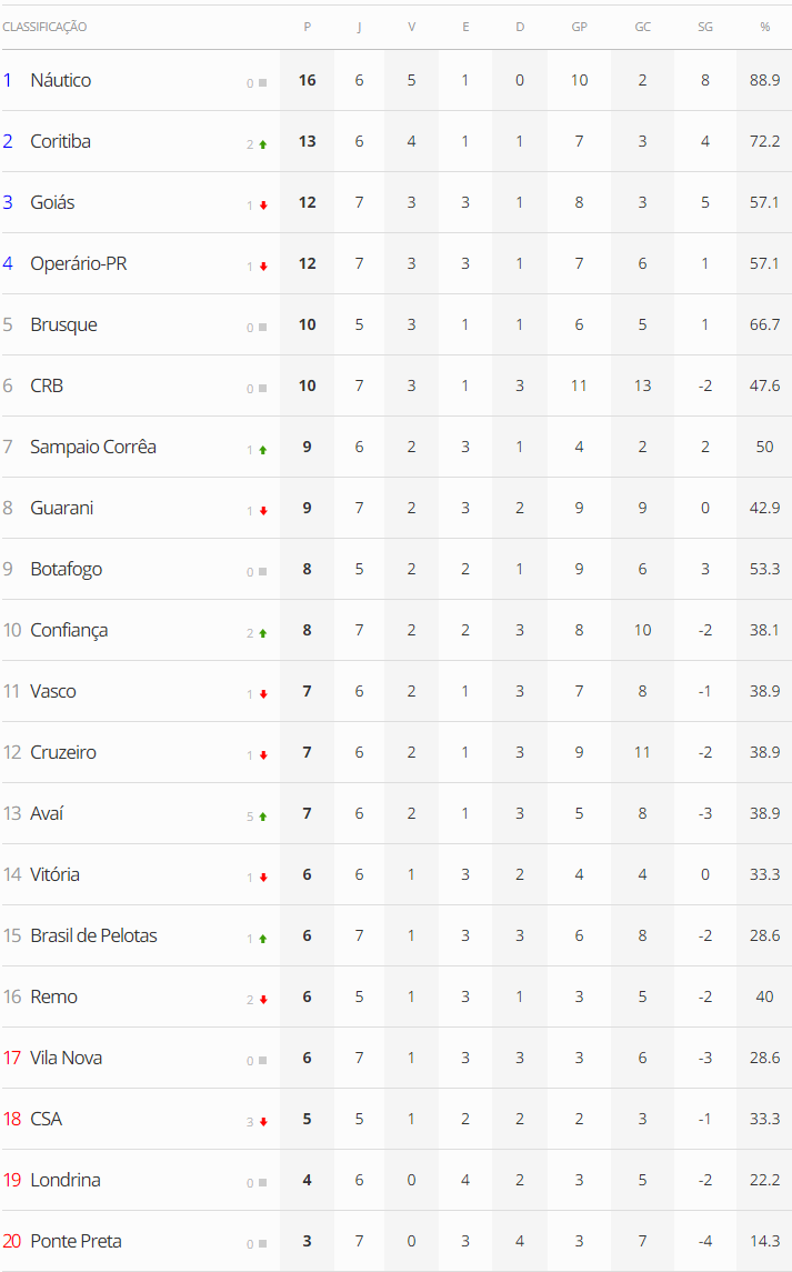 Veja a classificação da Série B após os jogos de 6ª-feira; Vasco está na 11ª posição