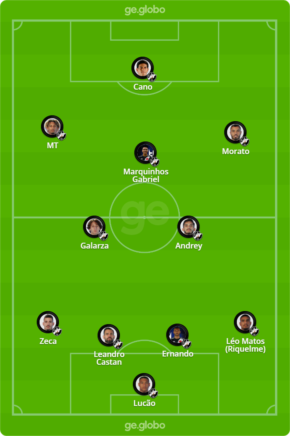 Desta forma, o provável Vasco é o seguinte: Lucão, Léo Matos (Riquelme), Ernando, Leandro Castan e Zeca; Andrey, Galarza, MT e Marquinhos Gabriel; Morato e Cano.
