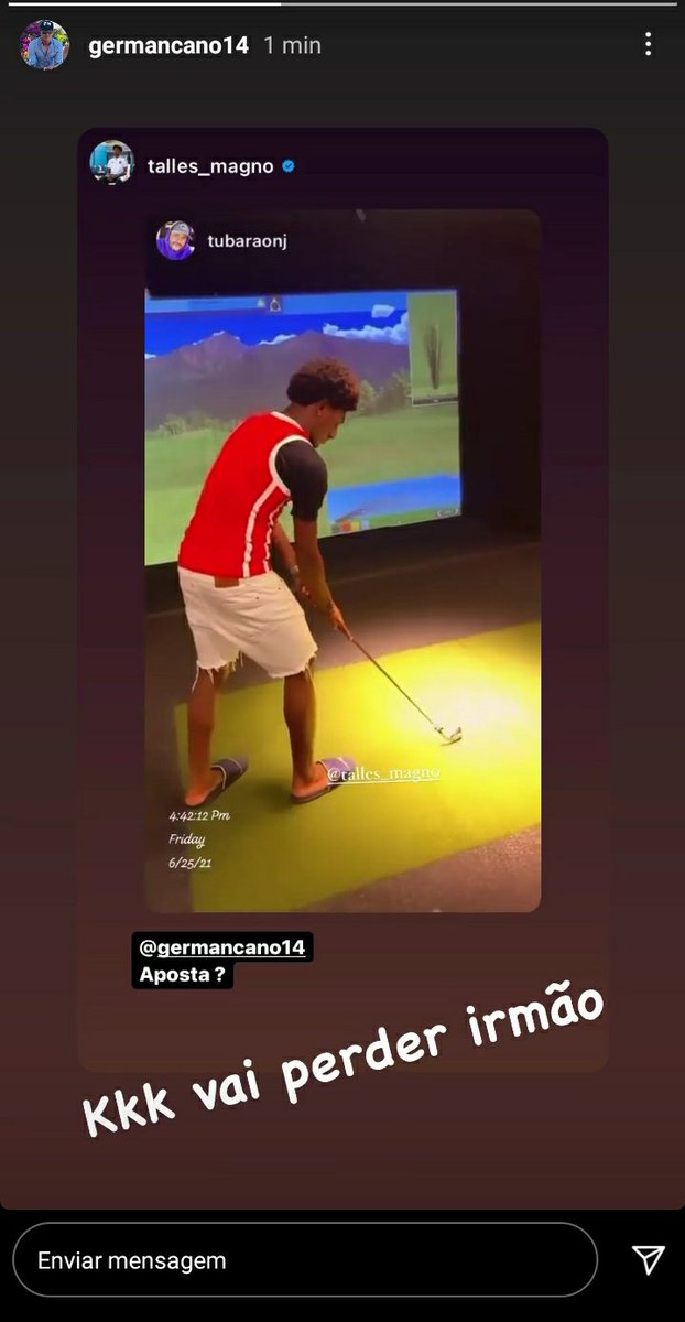 Germán Cano brinca em postagem de Talles Magno em simulador de golfe