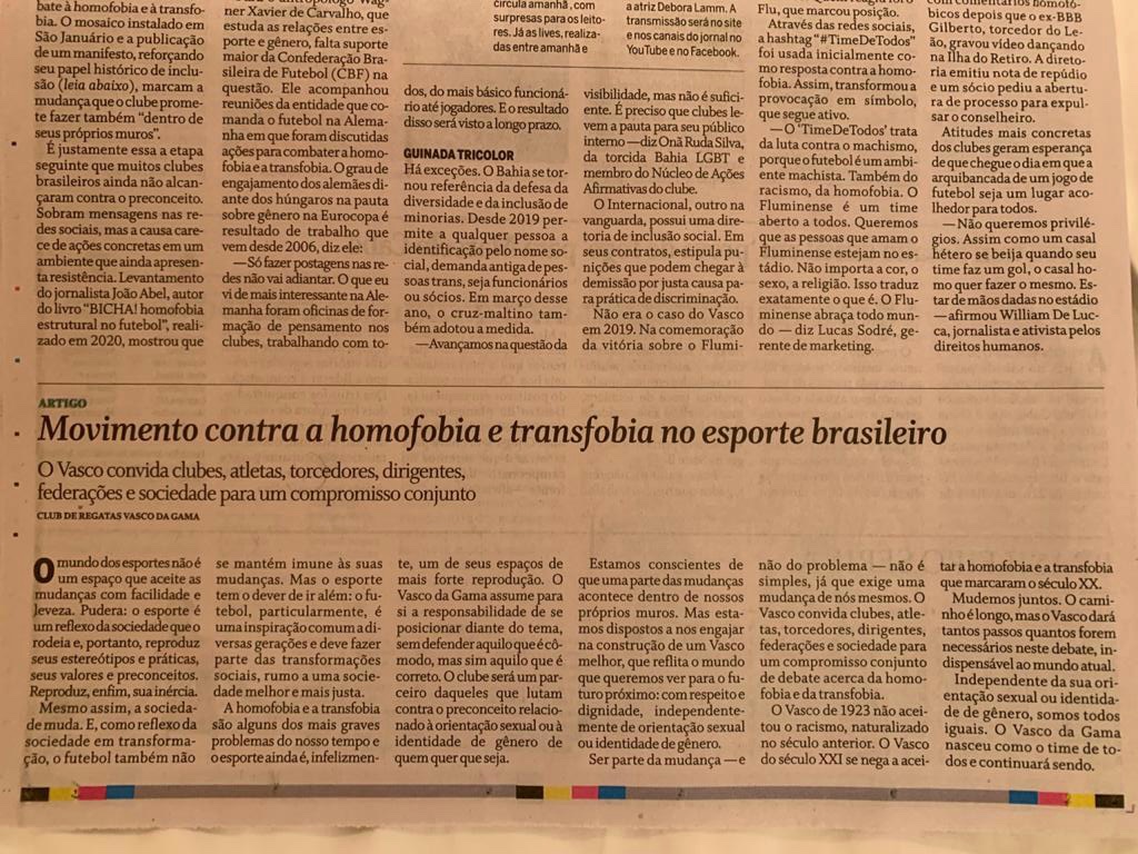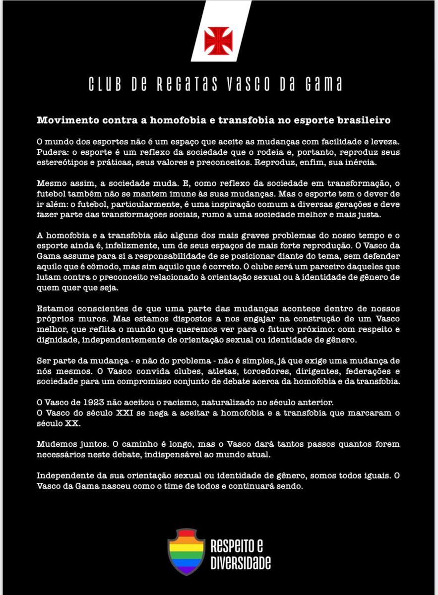 Estamos conscientes de que uma parte das mudanças acontece dentro de nossos próprios muros. Mas estamos dispostos a nos engajar na construção de um Vasco melhor, que reflita o mundo que queremos ver para o futuro próximo: com respeito e dignidade, independentemente de orientação sexual ou identidade de gênero.