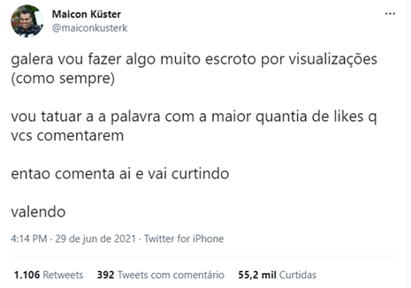 Tudo começou, nesta terça (29), quando o Youtuber e Influencer digital Maicon Küster divulgou que faria uma tatuagem com a palavra mais curtida dos comentários de sua publicação. Veja a publicação: