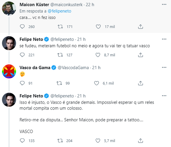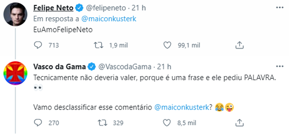 O perfil oficial do Vasco entrou na disputa, onde se posicionou chamando os vascaínos e seguidores de Casimiro para ganhar o embate de curtidas. Não obstante, ainda brincou com o comentário de Felipe Neto na tentativa de invalidá-lo.