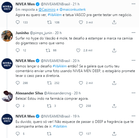 No meio da batalha da tatuagem, o perfil oficial da NIVEA Men apoiou a campanha pela palavra "VASCO" e foi provocada em estampar o nome da empresa na camisa do Cruz-Maltino. Respondendo, então, que prometia levar o caso para a diretoria se os vascaínos mandassem fotos com produtos da marca. Veja:
