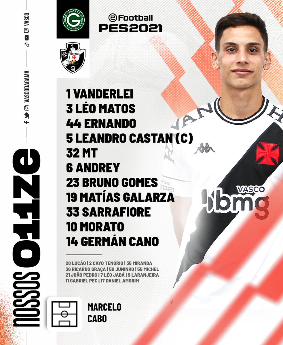 Confira a escalação do Vasco para o jogo contra o Goiás; Bruno Gomes e Sarrafiore são titulares