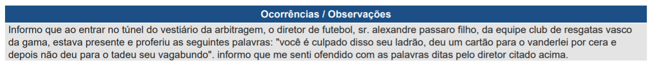 Árbitro de Goiás x Vasco diz na súmula que Pássaro o chamou de 'ladrão' e 'vagabundo'; veja relato