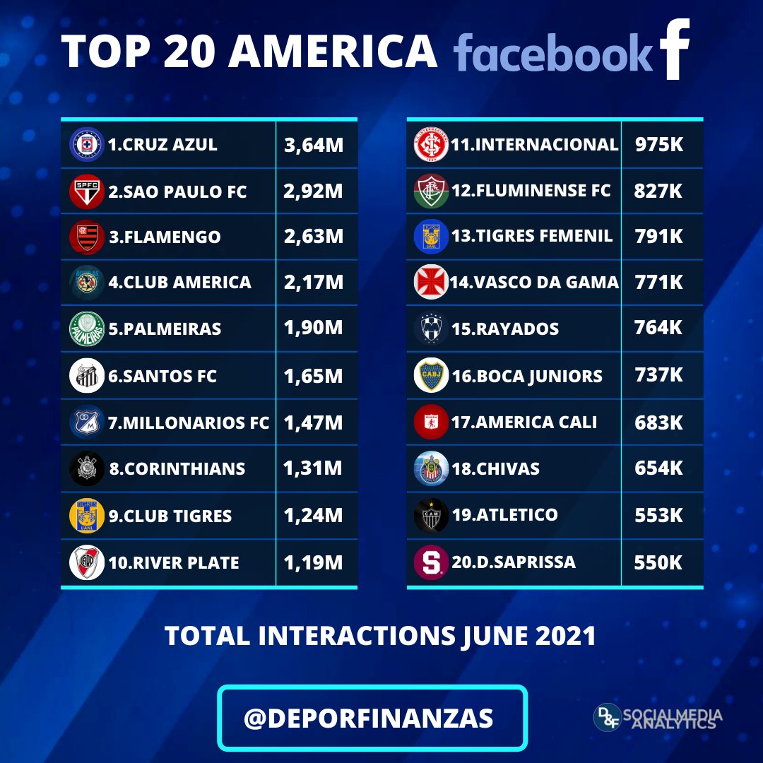 📲⚽ ¡Los 20 clubes de América con más interacciones en facebook durante junio 2021!💙👍😀😡😢😮😍⤴💬