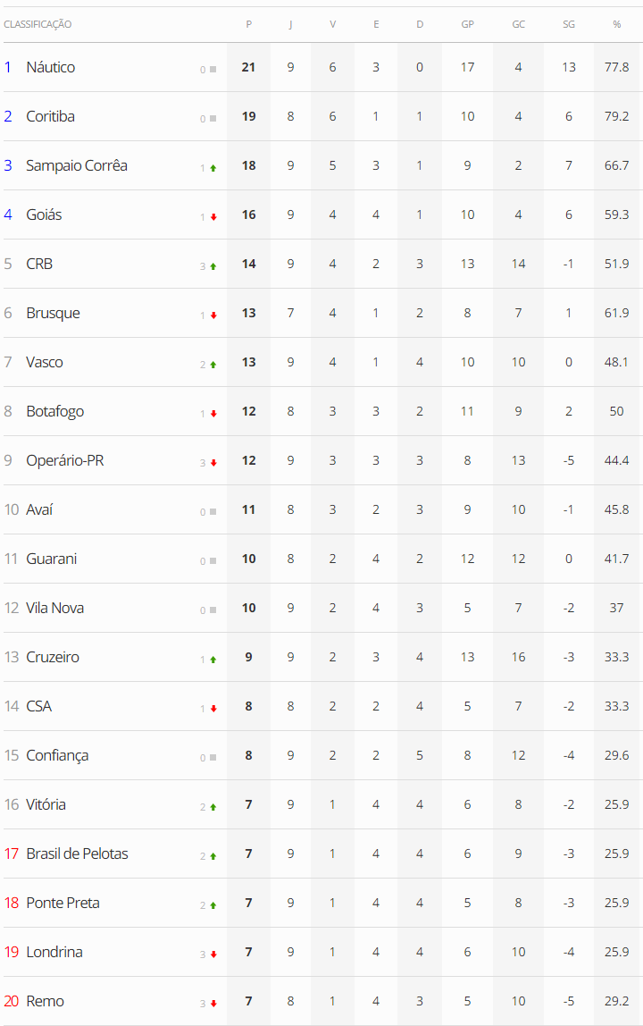 A um jogo do fim da 9ª rodada do Brasileiro da Série B, o Vasco, que derrotou o Confiança por 1 a 0, está na 7ª colocação e a 3 pontos do G4. O Gigante da Colina ainda pode terminar a rodada na 6ª posição dependendo do resultado de Guarani x Brusque.