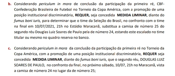 "O argumento de que o número 25 se ajusta mais a um meio campista do que o 24, não se sustenta, pois o número dele deveria ser 28 em diante, pois os anteriores a este, seriam todos da defesa. Entre as demais nove seleções da Copa América, num universo de 10, o número 24 é usado por: 4 meio campistas, 2 atacantes e 3 defensores. A simples dimensão do caso em si obriga a CBF a trocar a camisa 25 pela 24, ou seja, fazer o jogador Douglas Luiz vestir a camisa, ressaltando e podendo então deixar mais claro que não há omissão por parte da Requerida".