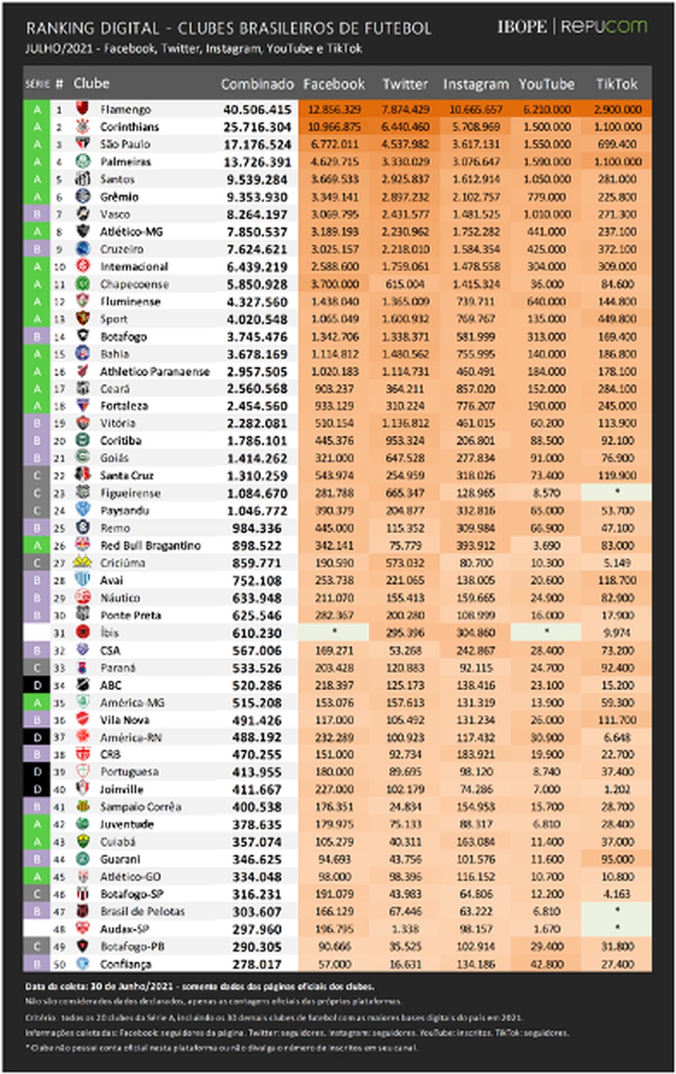 A pesquisa considerou os meses de janeiro a junho, nos perfis oficiais dos 50 clubes com maiores bases digitais do Brasil.