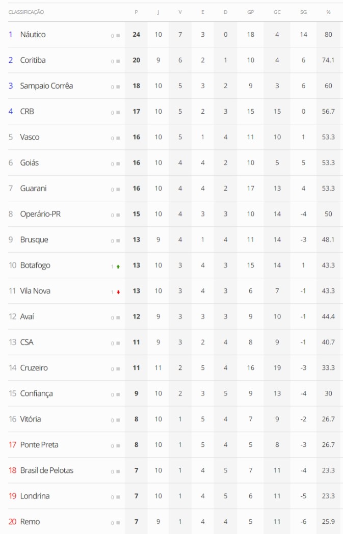 Terminada a 10ª rodada do Brasileiro da Série B, o Vasco, que derrotou o Sampaio Corrêa por 1 a 0, subiu do 6º para o 5º lugar na classificação.