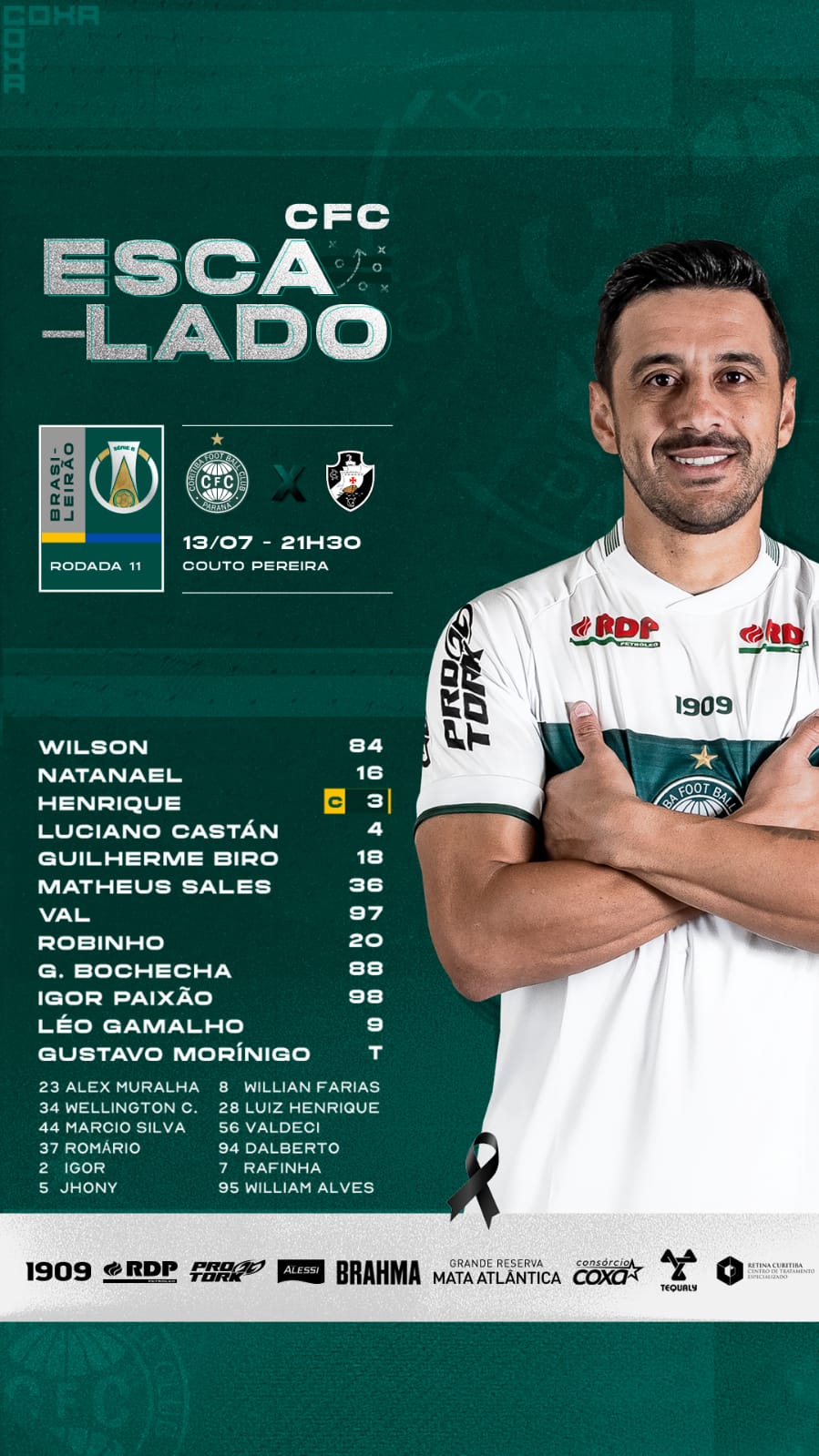 Veja a escalação do Coritiba para o jogo contra o Vasco