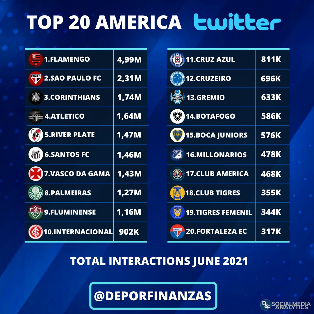 📲⚽ ¡Los 20 clubes de América con más interacciones en #twitter durante junio 2021!🔃💙💬