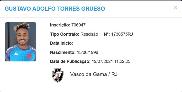 Rescisão de Gustavo Torres, ex-Vasco, é publicada no BID da CBF