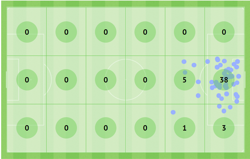 Por ter mais jogadores que atacam a profundidade pelo lado direito (seja com Jabá, Léo Matos ou Pec), as principais jogadas vêm por esse setor. Dividindo o campo em 18 zonas fica claro como o Vasco utiliza bastante o corredor direito e o meio espaço. Além disso, outras chances criadas foram pelo corredor central na zona chamada como funil.