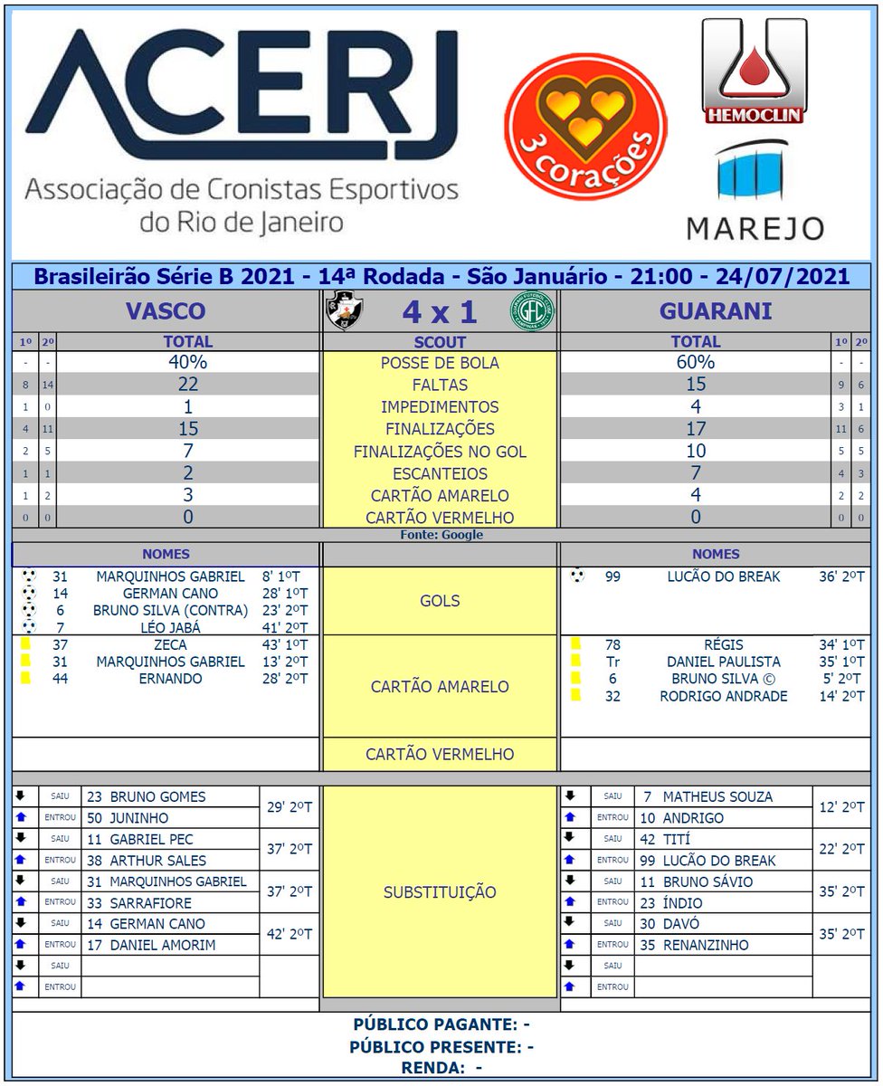 Vasco: Marquinhos Gabriel, aos 8' do 1ºT, Cano, aos 28' do 1ºT, Bruno Silva, contra, aos 23' do 2ºT, e Léo Jabá, aos 41' do 2ºT