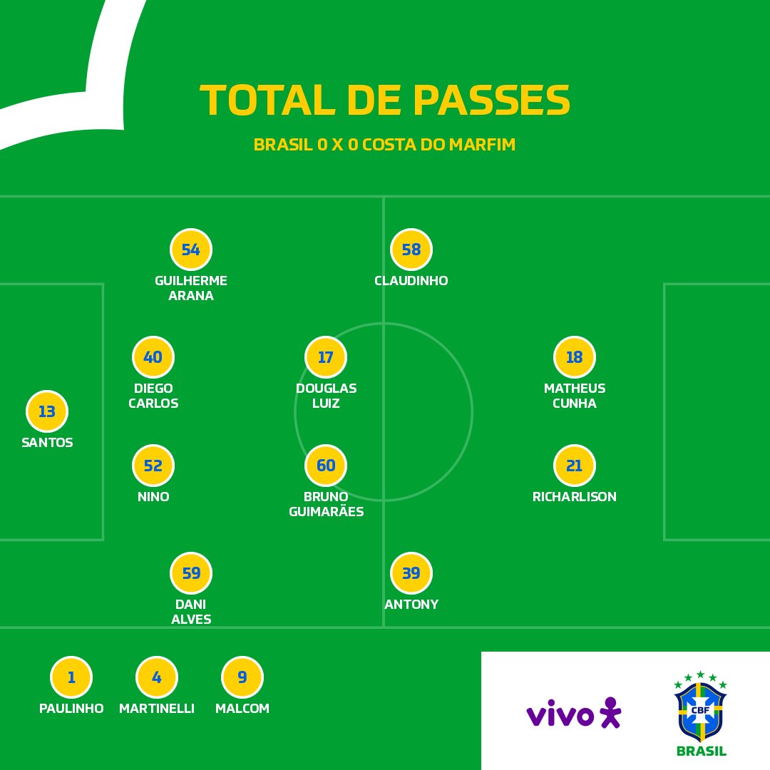 Brasil: Santos; Daniel Alves, Nino, Diego Carlos, Arana; Douglas Luiz, Bruno Guimarães, Claudinho; Antony (Malcom), Matheus Cunha (Gabriel Martinelli) e Richarlison (Paulinho).