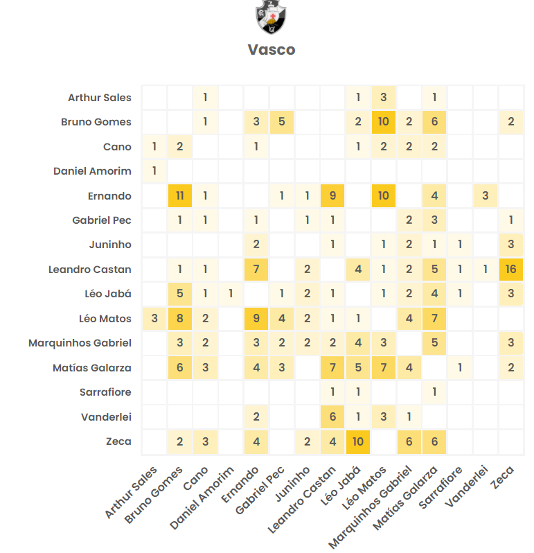 Confira os mapas de passes e interação entre jogadores em Vasco 4 x 1 Guarani