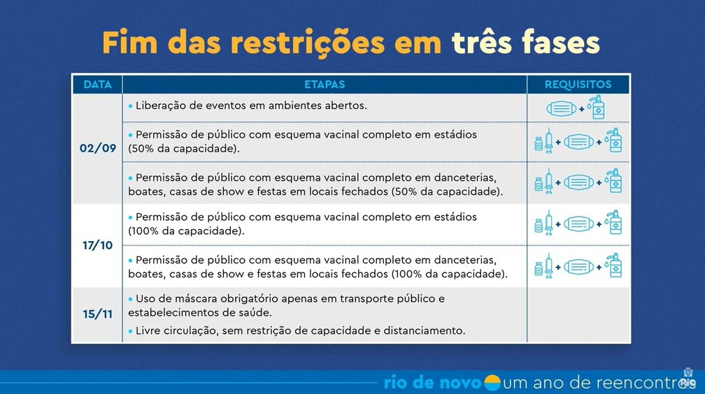 A primeira etapa, que já prevê reabertura de estádios e boates com 50% do público, depende de 77% dos cariocas já terem recebido a primeira dose da vacina contra a Covid e 45%, a segunda dose.