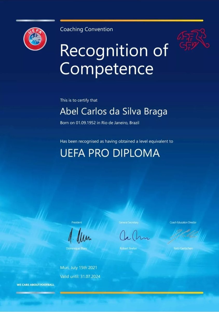 [OFF:] Abel Braga foi diplomado de forma inédita pela UEFA. Ele recebeu a licença PRO da entidade, sem precisar passar pelo famoso curso. Uma honraria por reconhecimento de competência. Parabéns!