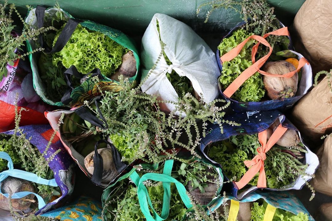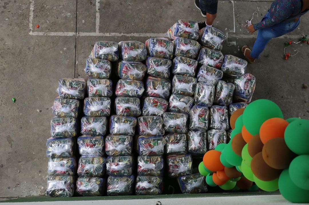 Foram 40 cestos do Assentamento Terra Prometida em Xerém, com frutas, legumes e verduras orgânicas e 69 cestas básicas kit 2 do Assaí.