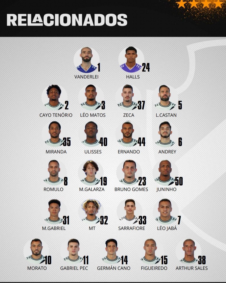 O Vasco acaba de divulgar a relação de jogadores para o jogo de daqui a pouco contra o São Paulo, em São Januário, pela Copa do Brasil. O técnico Lisca só terá mesmo os desfalques de Riquelme e Michel, ambos no DM. Nenhum jogador foi poupado pelo treinador. Confira!
