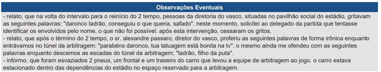 - Relato que após o término do 2º tempo, o senhor Alexandre Pássaro, diretor do Vasco, proferiu as seguintes palavras de forma irônica enquanto entrávamos no túnel da arbitragem: "Parabéns Daronco, tua tatuagem tá bonita na tv". O mesmo ainda me ofendeu com as seguintes palavras enquanto descemos as escadas do túnel de arbitragem: "Ladrão, filho da p..."