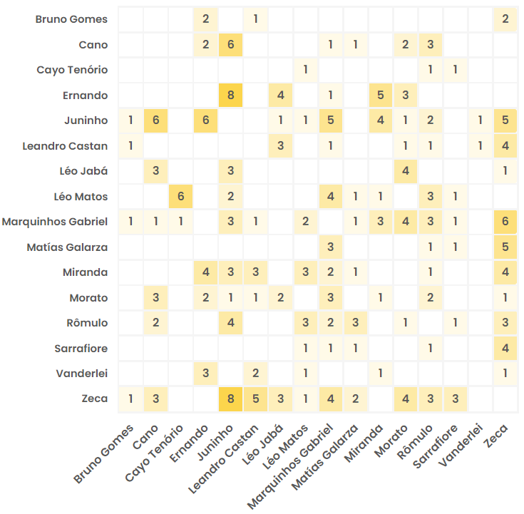 Tendo em vista a boa organização na fase ofensiva trago o mapa de interação de passes dos jogadores. Confira abaixo: