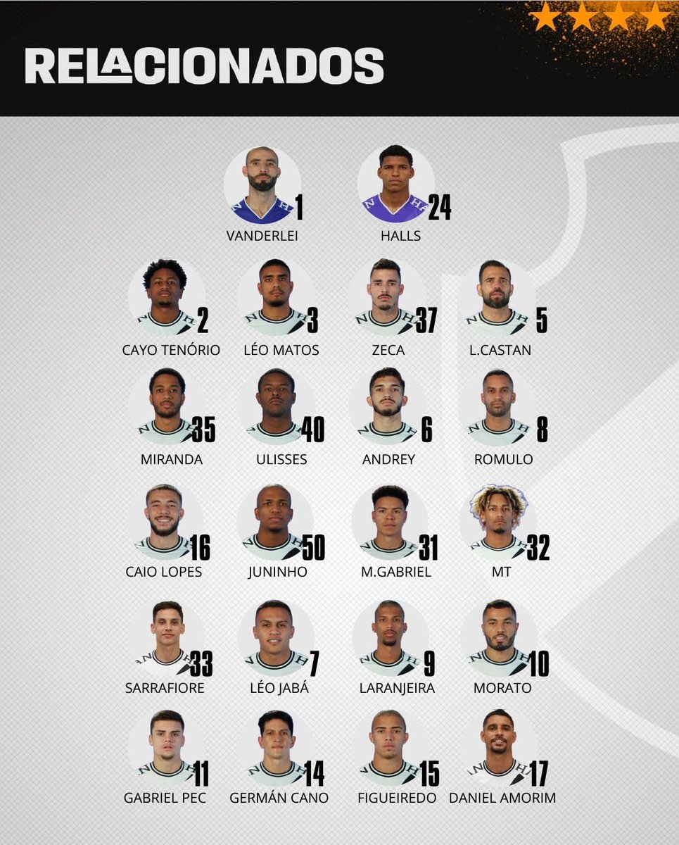Estes são os relacionados do Vasco. Bruno Gomes, Michel e Riquelme estão lesionados. Ernando e Galarza também não constam, mas, de acordo com o clube, foram apenas preservados fisicamente. #lanceBARRADAO