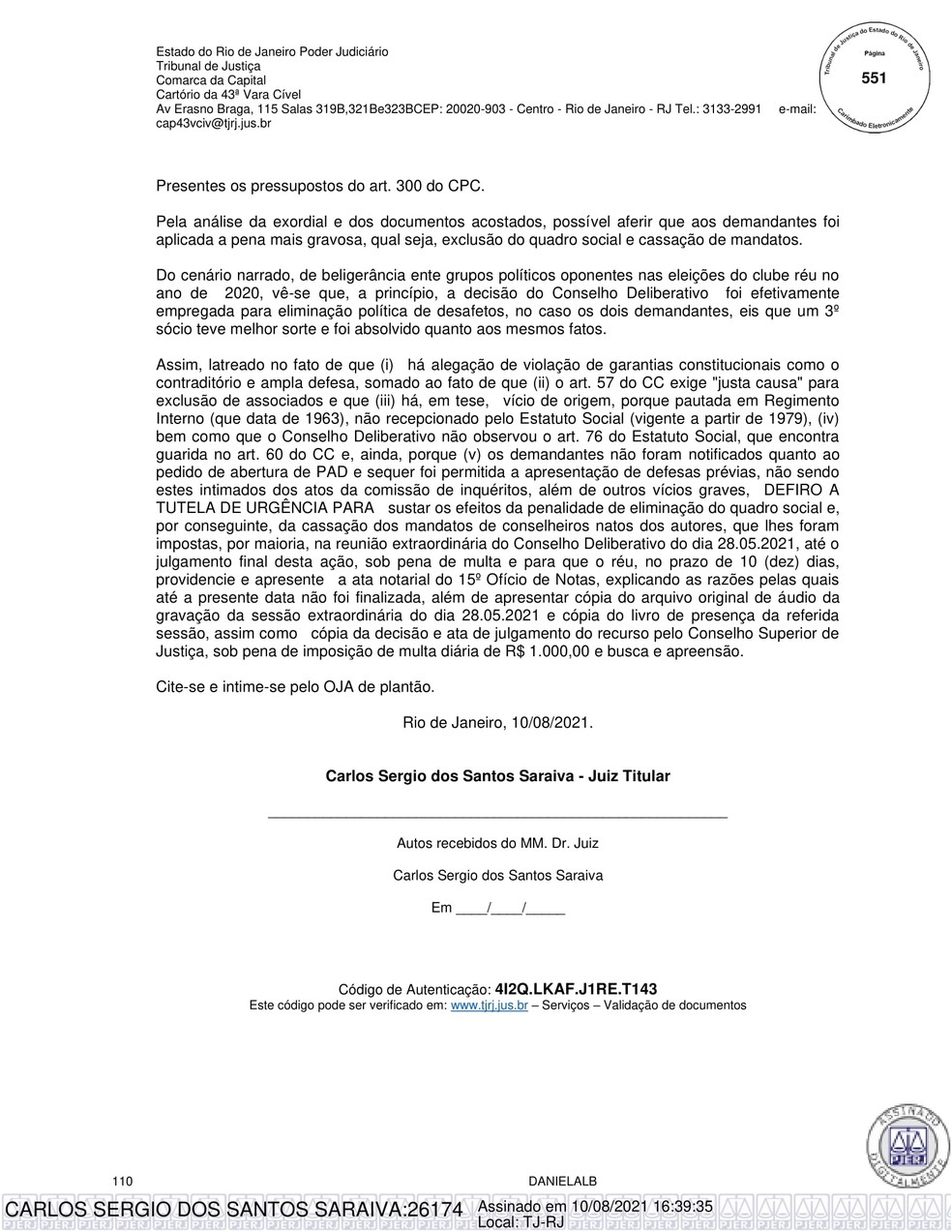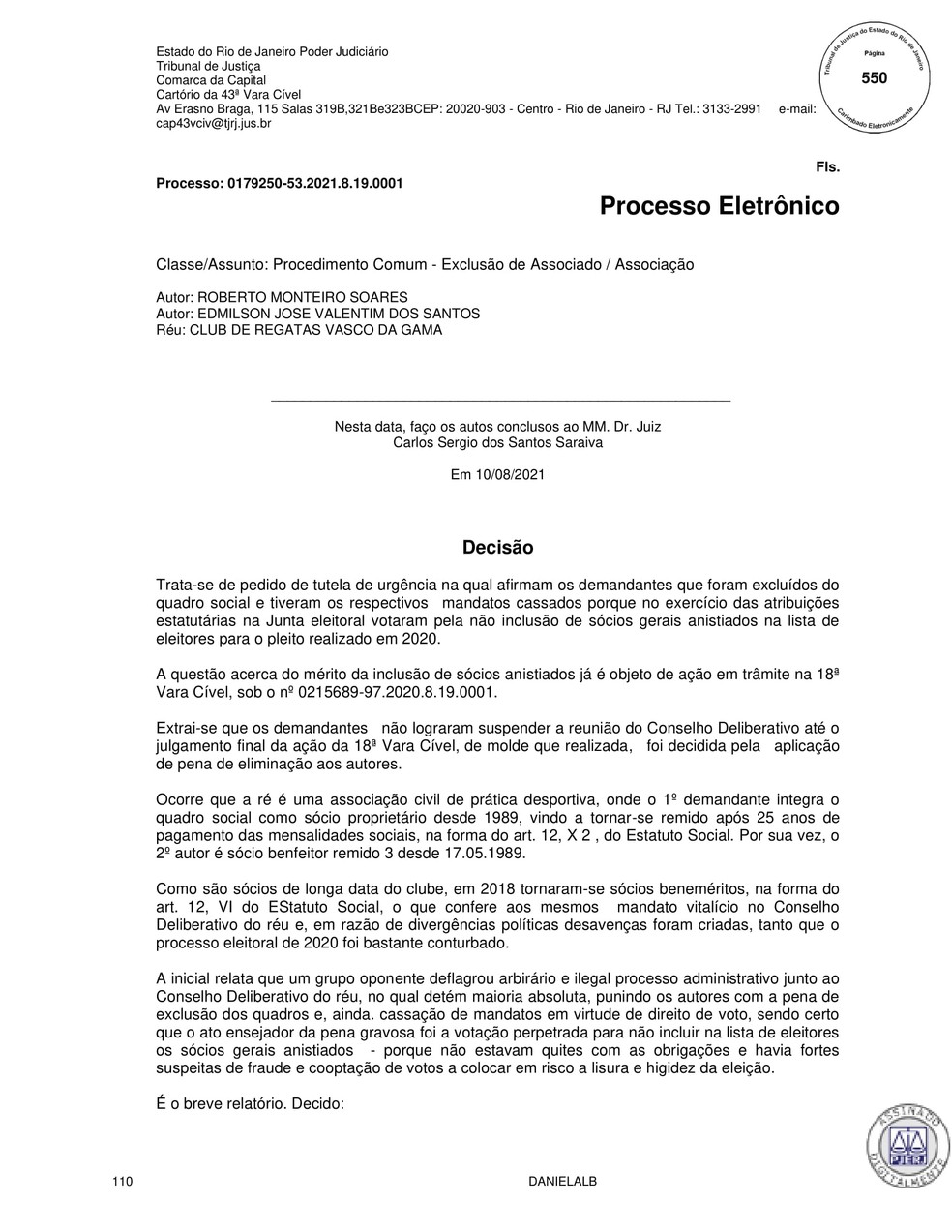 Em decisão proferida nesta terça-feira pelo juiz Carlos Sergio dos Santos Saraiva, titular da 43ª Vara Cível do Tribunal de Justiça do Rio de Janeiro (TJ/RJ), ficou determinado que Roberto Monteiro e Edmílson Valentim, respectivamente presidentes dos conselhos Deliberativo e Fiscal no mandato de Alexandre Campello, estão de volta ao quadro social do Vasco.