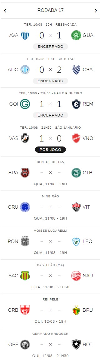 Quatro jogos abriram, nesta 3ª-feira, a 17ª rodada do Brasileiro da Série B. O Vasco, que venceu o Vila Nova em São Januário por 1 a 0, está em 4º lugar.