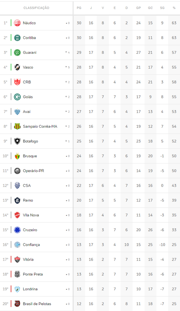Confira a classificação do Brasileiro da Série B após os jogos desta 3ª-feira; Vasco está em 4º lugar