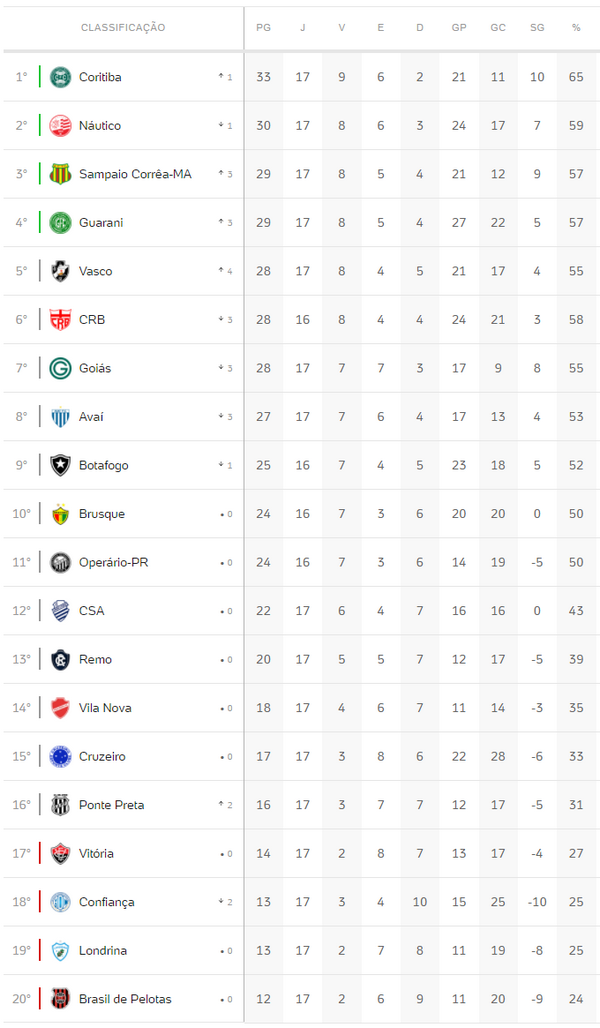 Confira a classificação do Brasileiro da Série B após os jogos desta 4ª-feira; Vasco está em 5º lugar