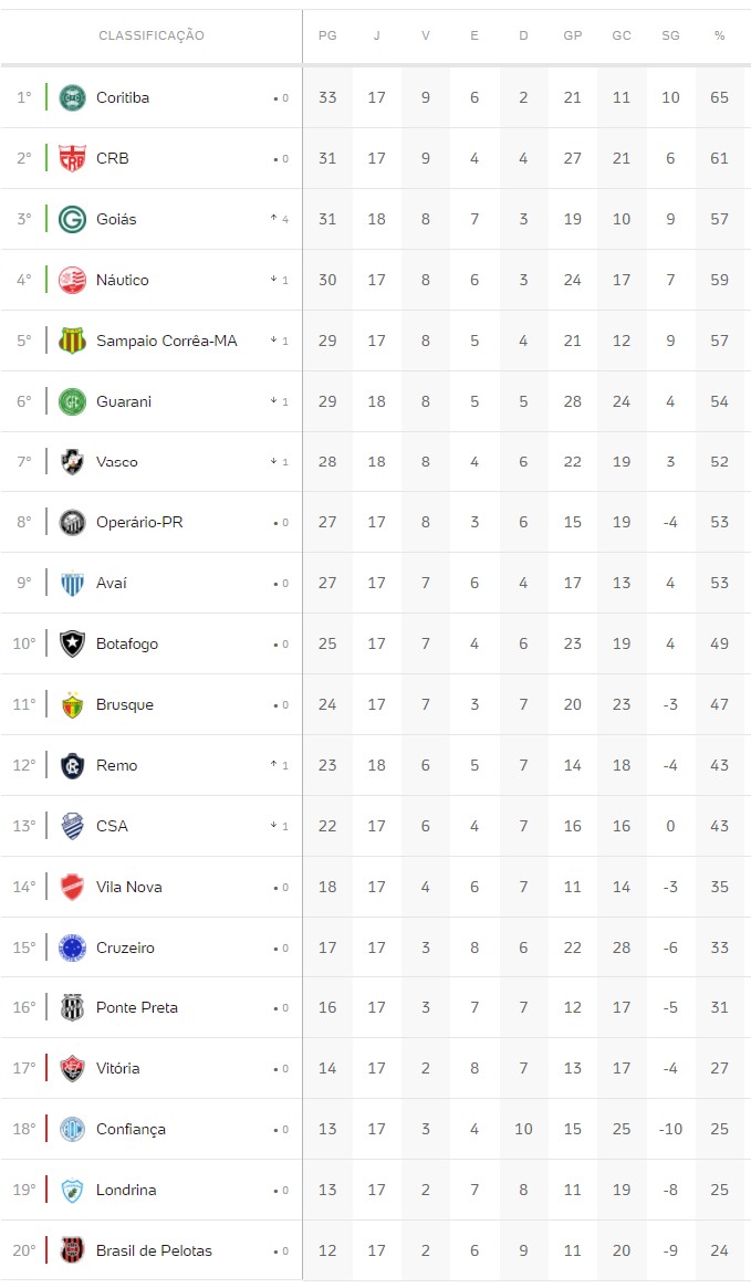 Confira a classificação do Brasileiro da Série B após os jogos desta 6ª-feira; Vasco está em 7º lugar