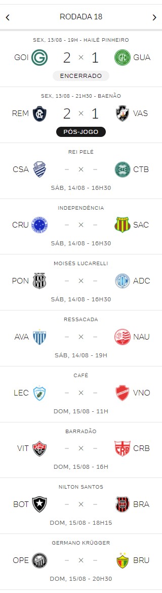 Dois jogos abriram, nesta sexta-feira, a 18ª rodada do Brasileiro da Série B. O Vasco, que perdeu para o Remo em Belém por 2 a 1, está em 7º lugar.