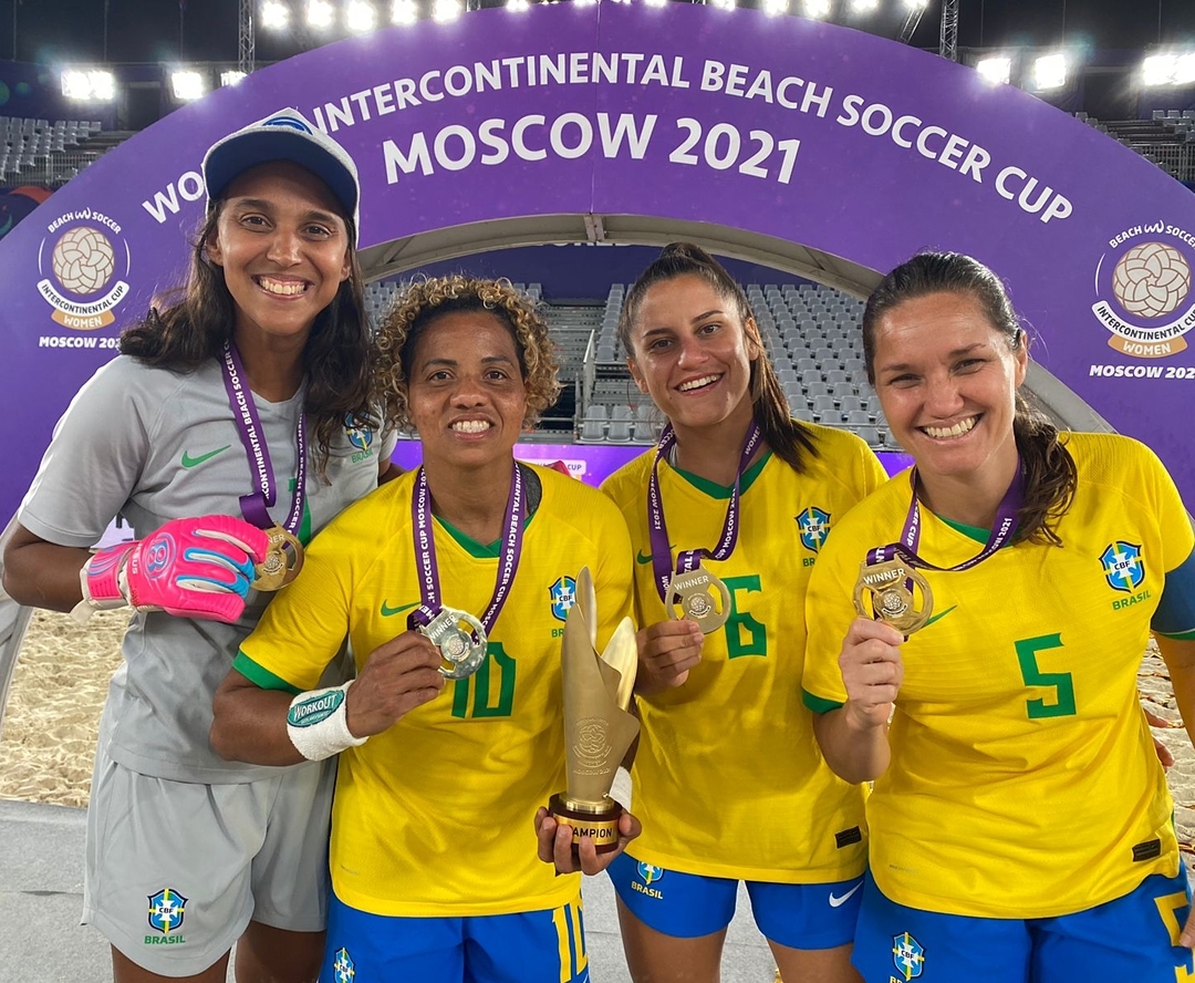 Beach Soccer Feminino: Natalie, Dani Barboza, Milene e Jasna exibem medalhas de ouro da Copa Intercontinental pela Seleção